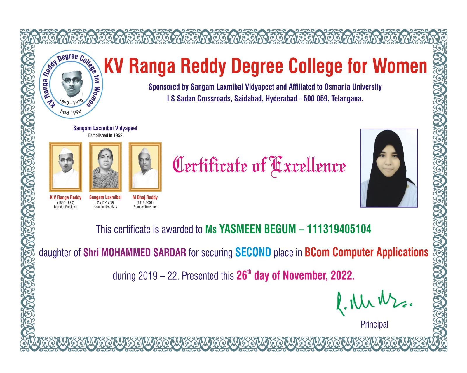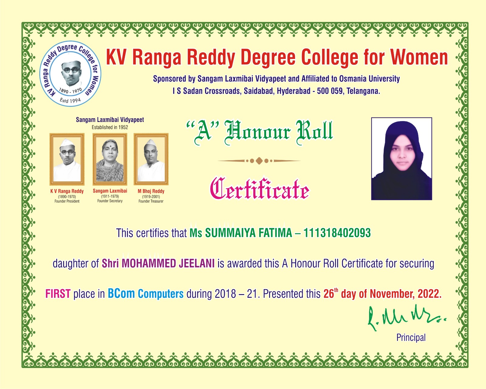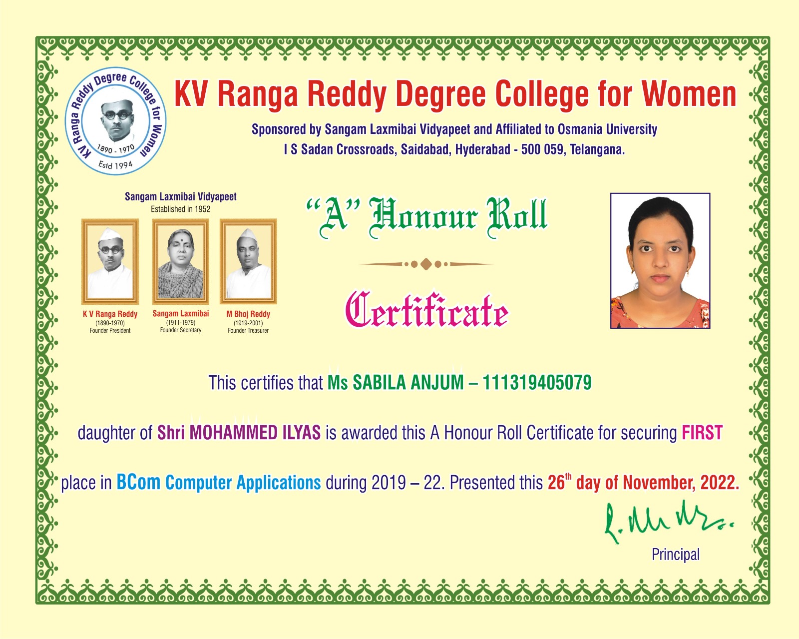 | 5. | Commerce | FIRST | 111319405079 | BCom (Computer Applications) | SABILA ANJUM | MOHAMMED ILYAS | NASREEN SULTANA | 9.57 |