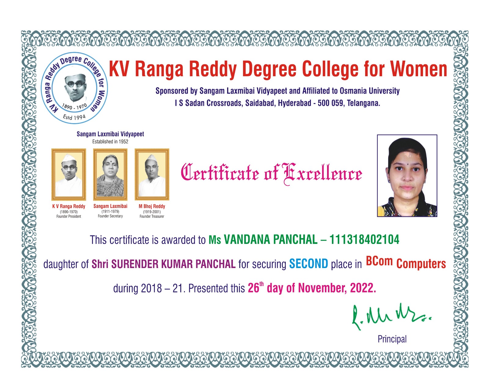 | 6. | SECOND | 111318402104 | BCom (Computers) | VANDANA PANCHAL | SURENDER KUMAR PANCHAL | KAVITA PANCHAL | 9.43 |