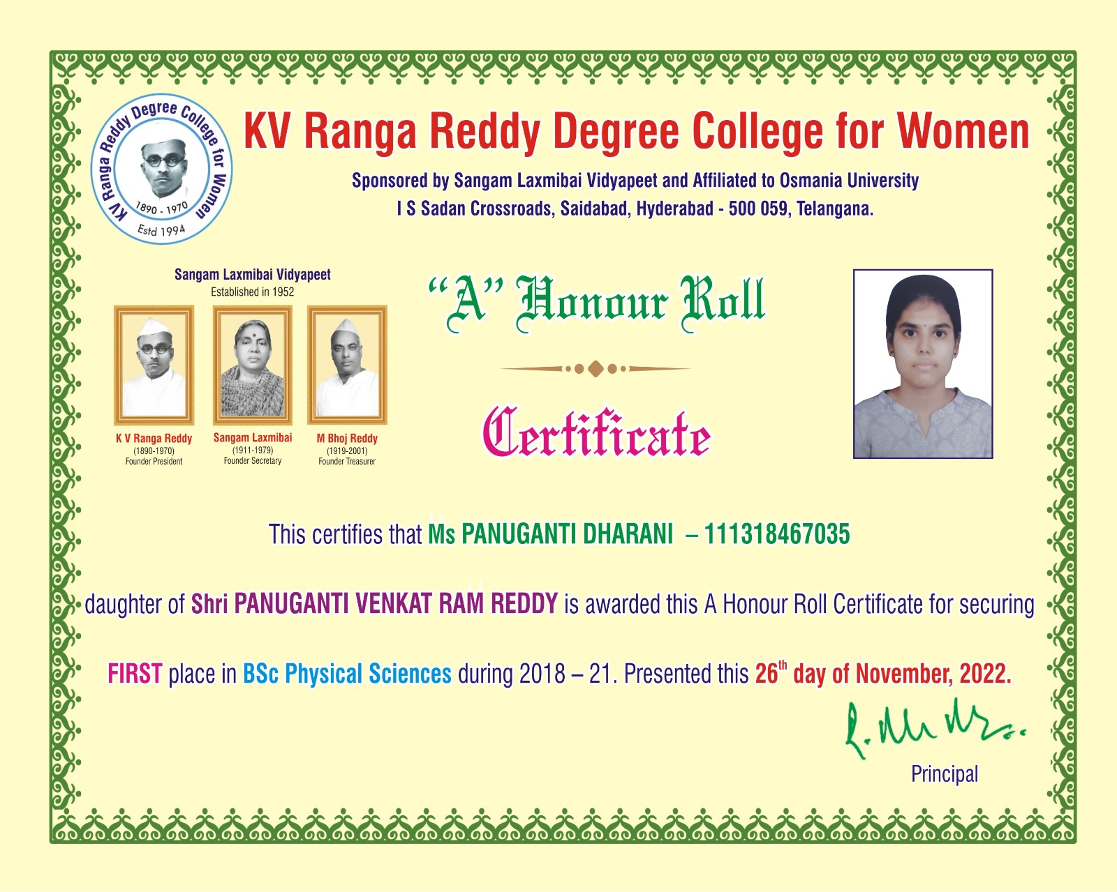 | 3. | Physical Sciences | FIRST | 111318467035 | BSc (M S CS) | PANUGANTI DHARANI | PANUGANTI VENKAT RAM REDDY | PANUGANTI SUJATHA | 9.57 |