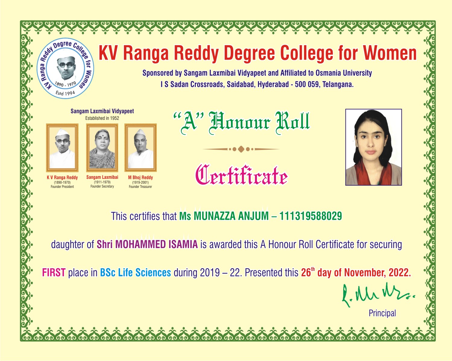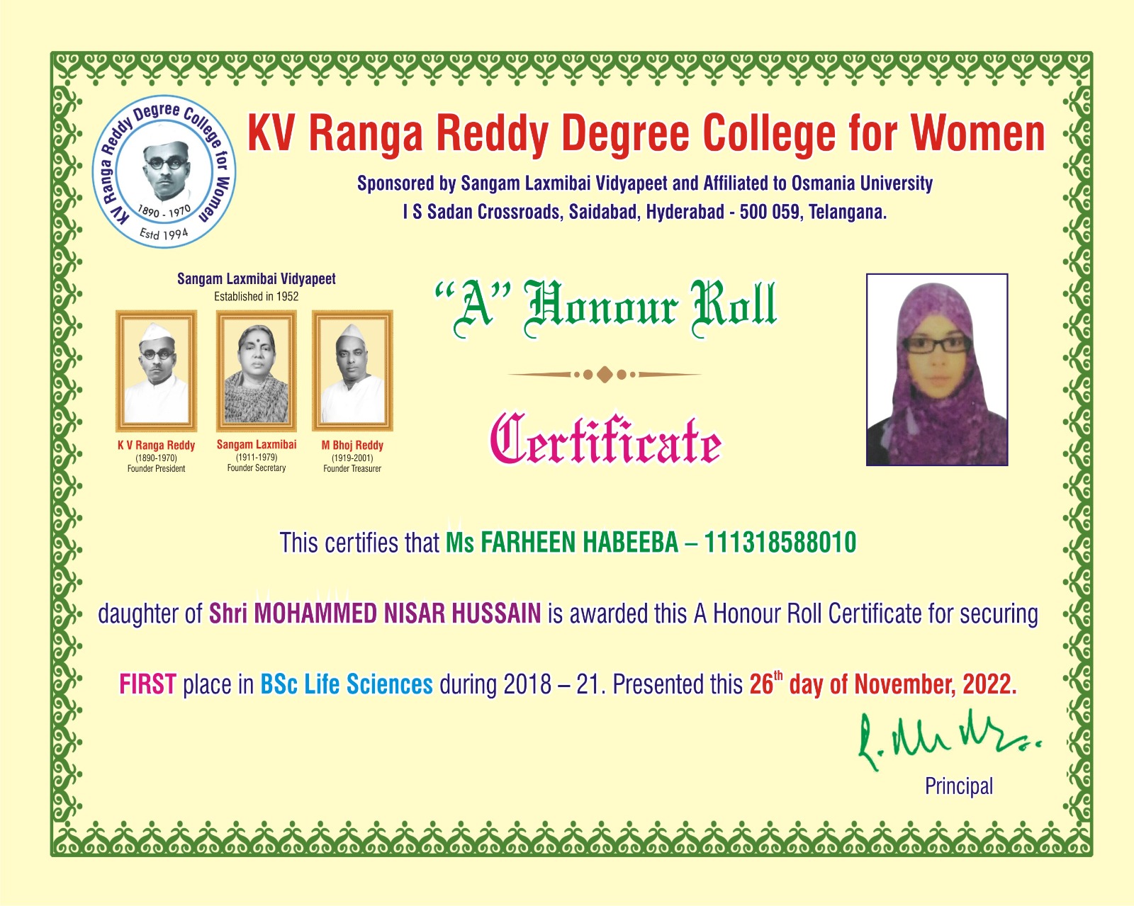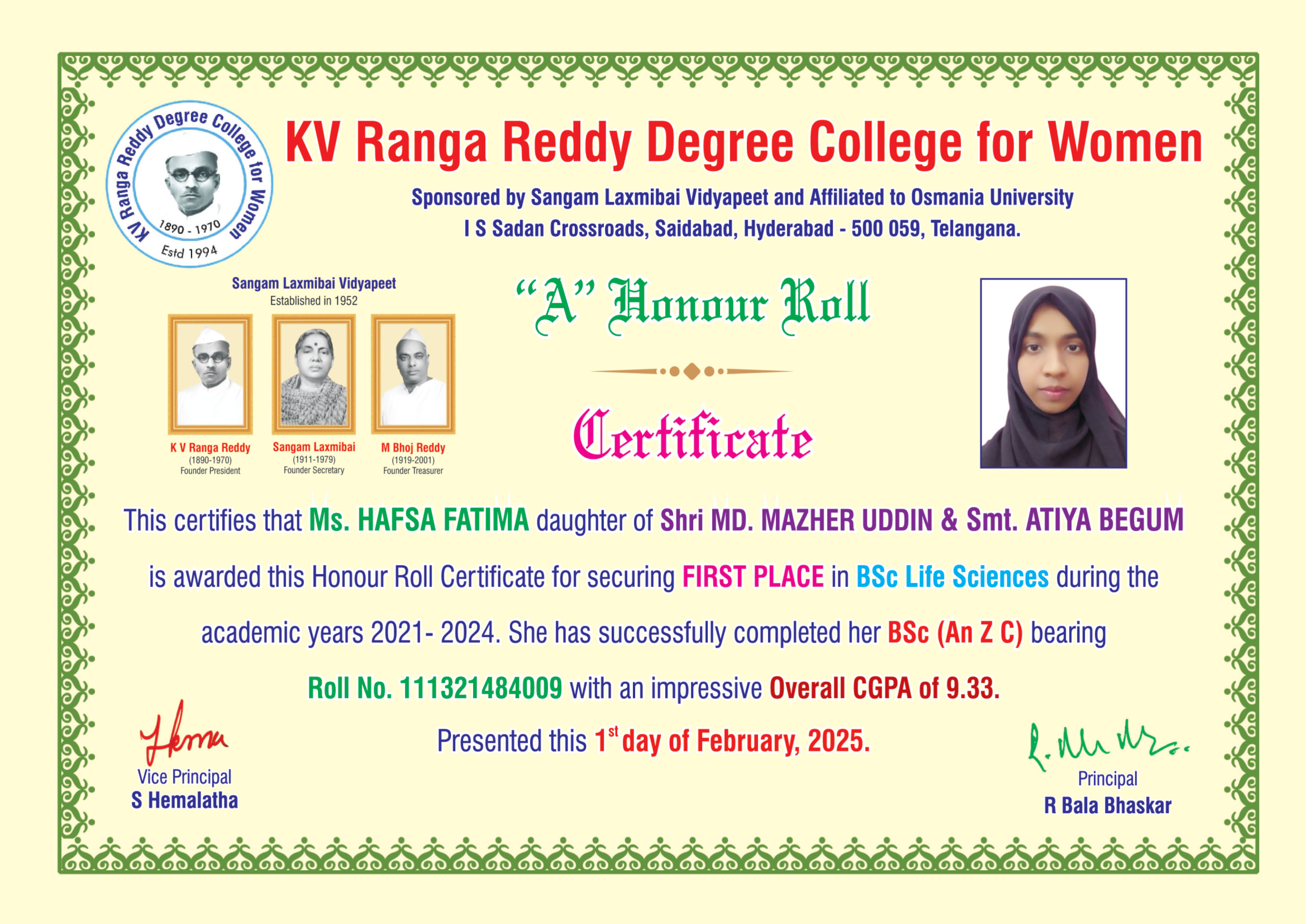 | 1. | Life Sciences | FIRST | 111321484009 | BSc (An Z C) | HAFSA FATIMA | MD MAZHER UDDIN | ATIYA BEGUM | 9.33 |