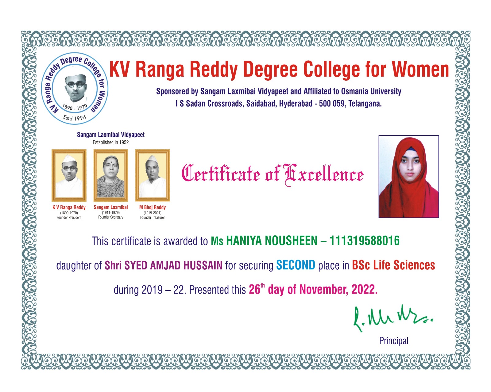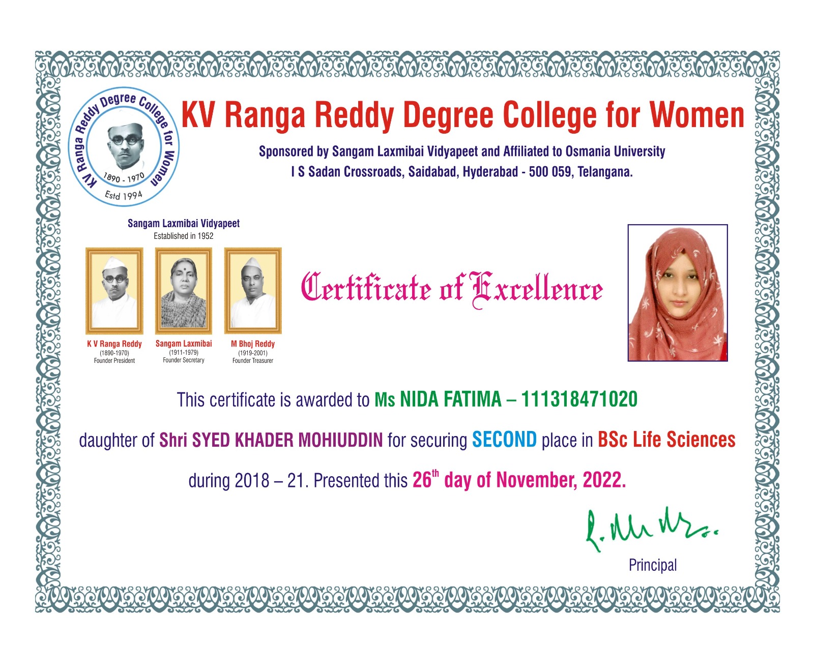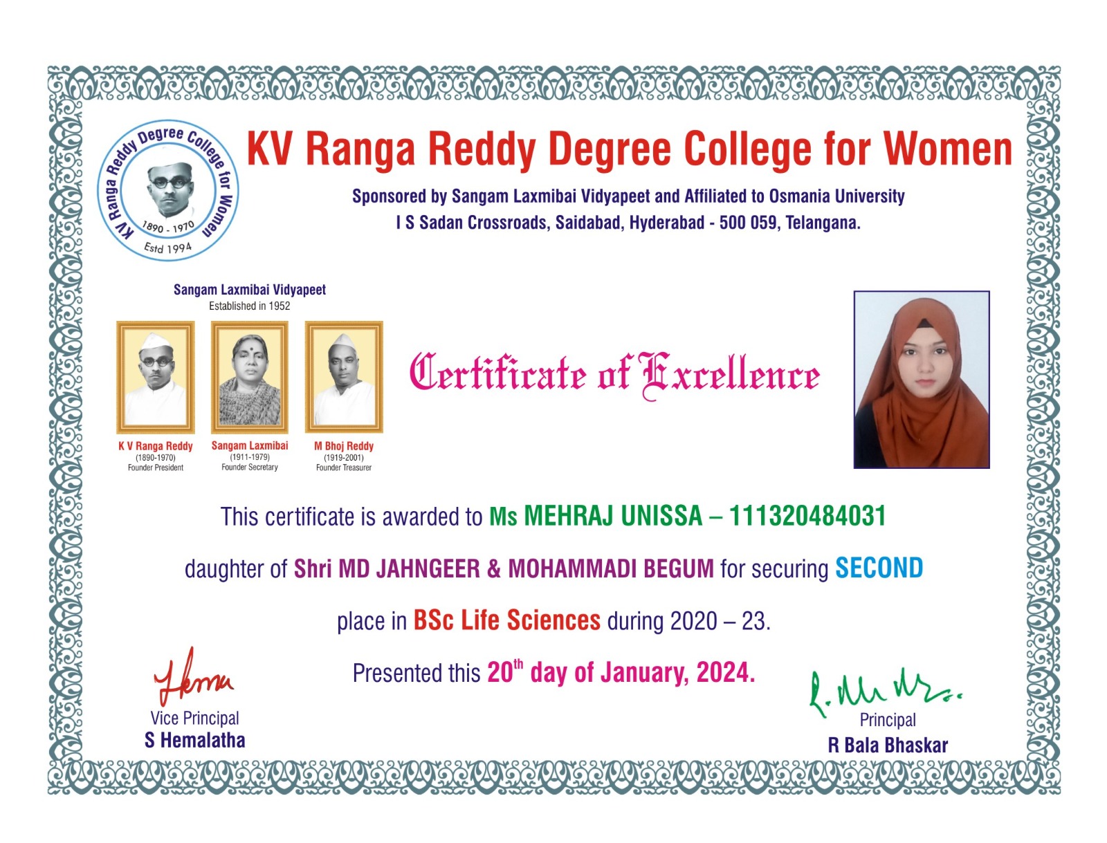 | 1. | Life Sciences | FIRST | 111321484009 | BSc (An Z C) | HAFSA FATIMA | MD MAZHER UDDIN | ATIYA BEGUM | 9.33 |