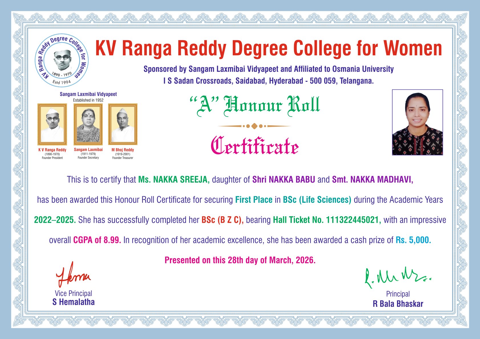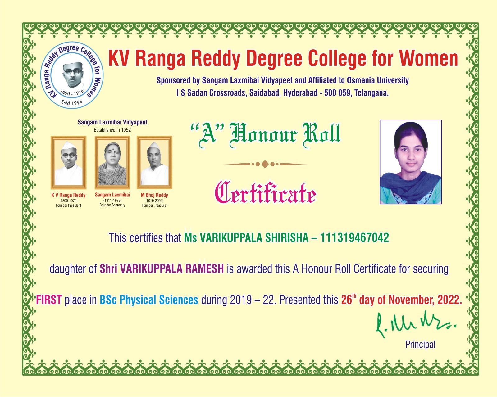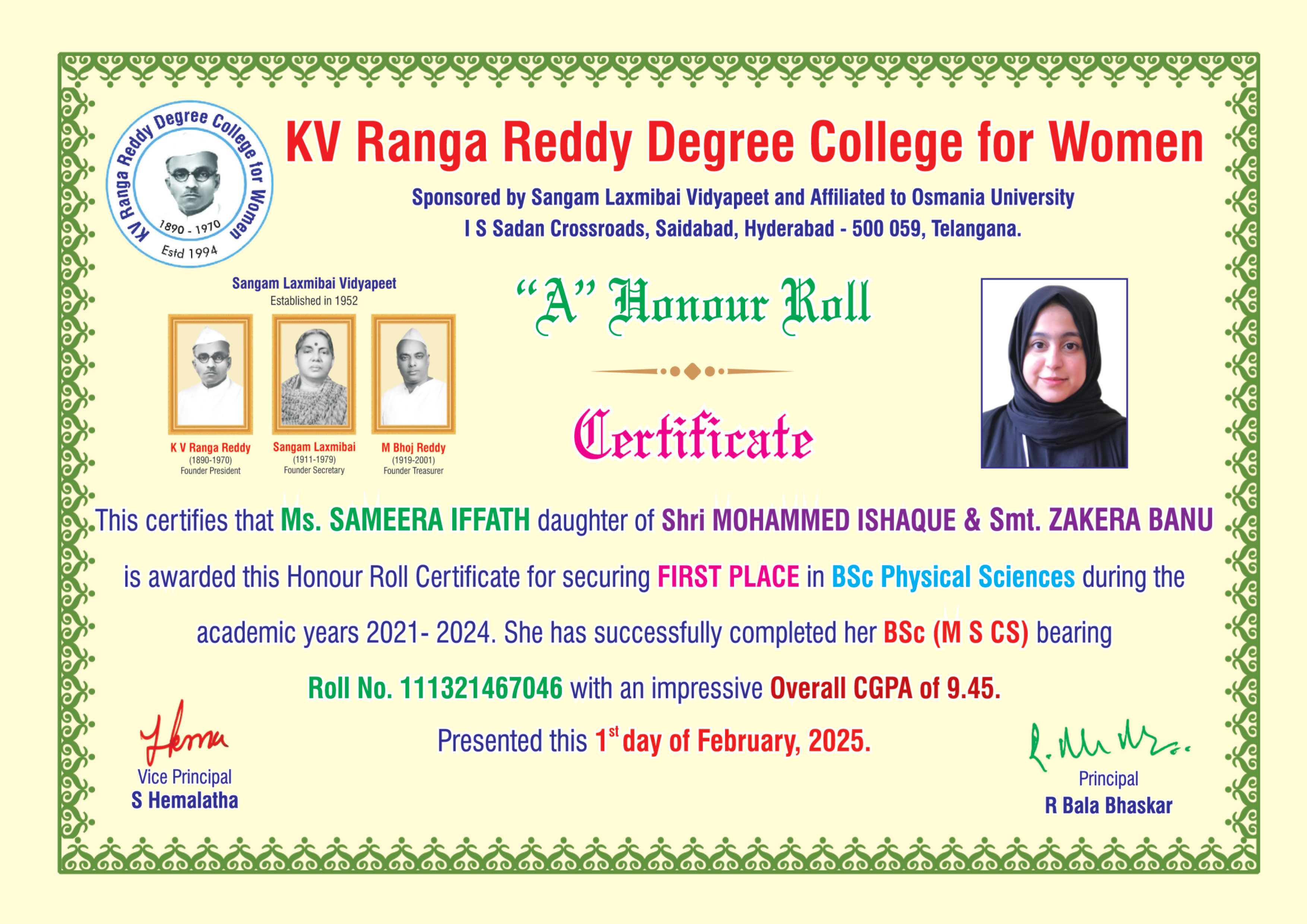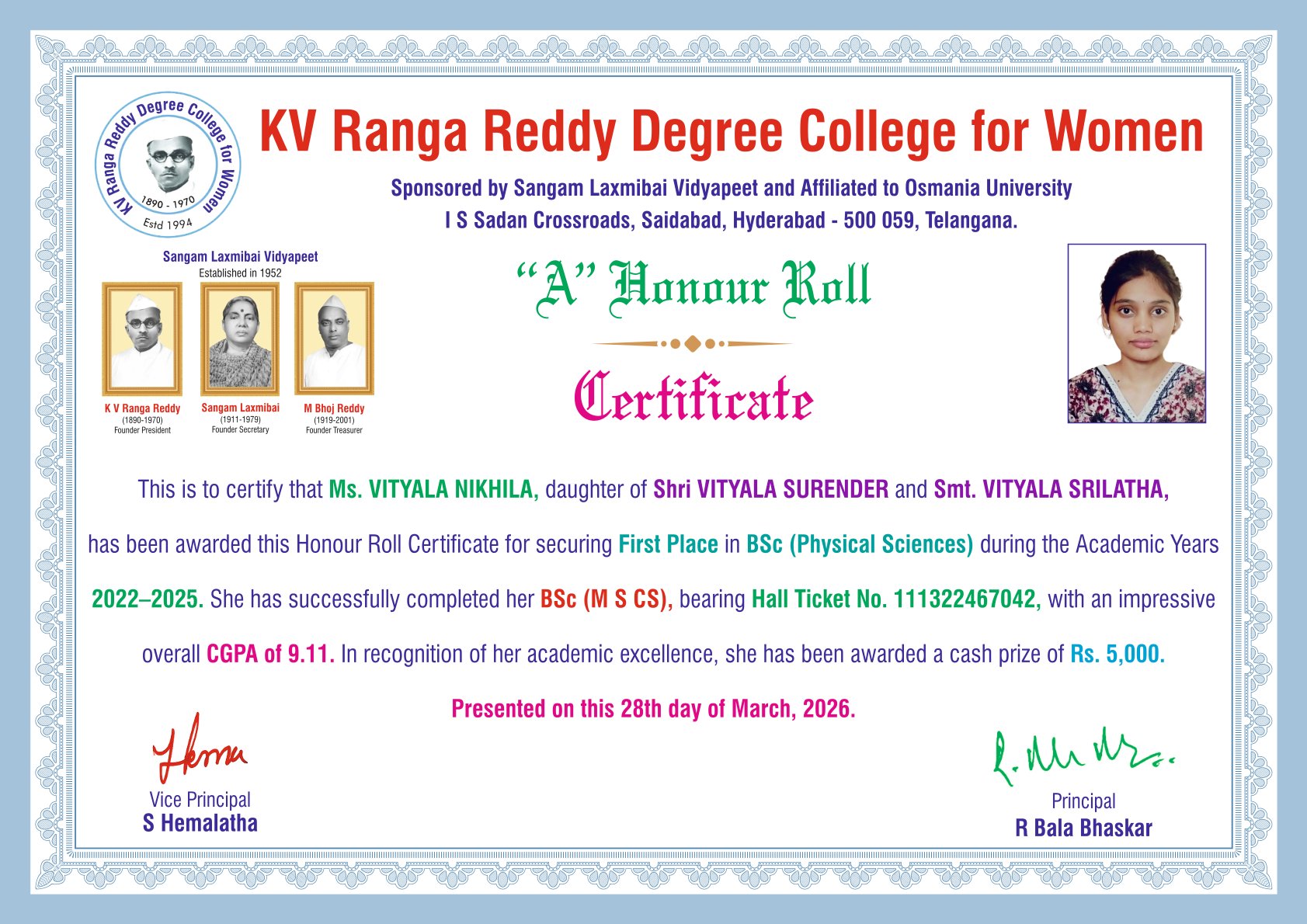 | 3. | Physical Sciences | FIRST | 111322467042 | BSc (M S CS) | VITYALA NIKHILA | VITYALA SURENDER | VITYALA SRILATHA | 9.11 |