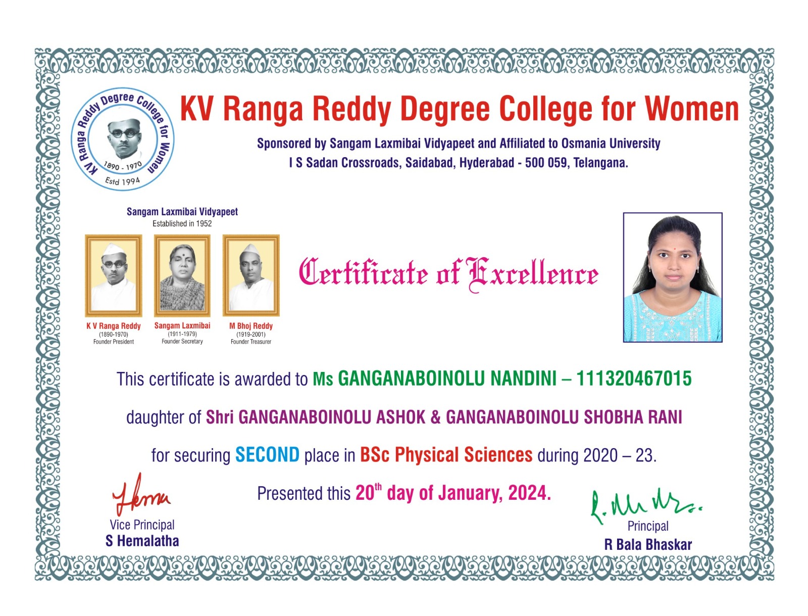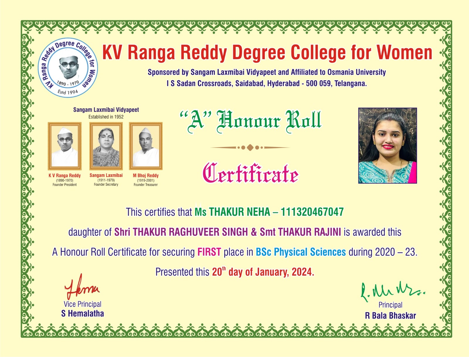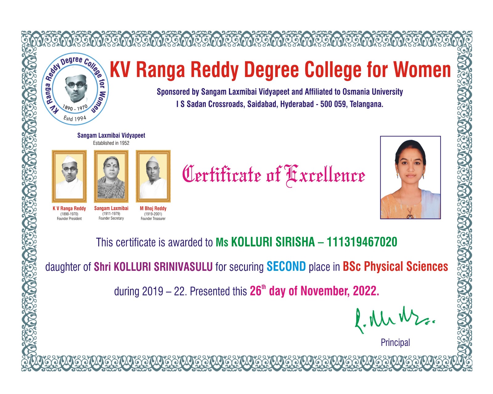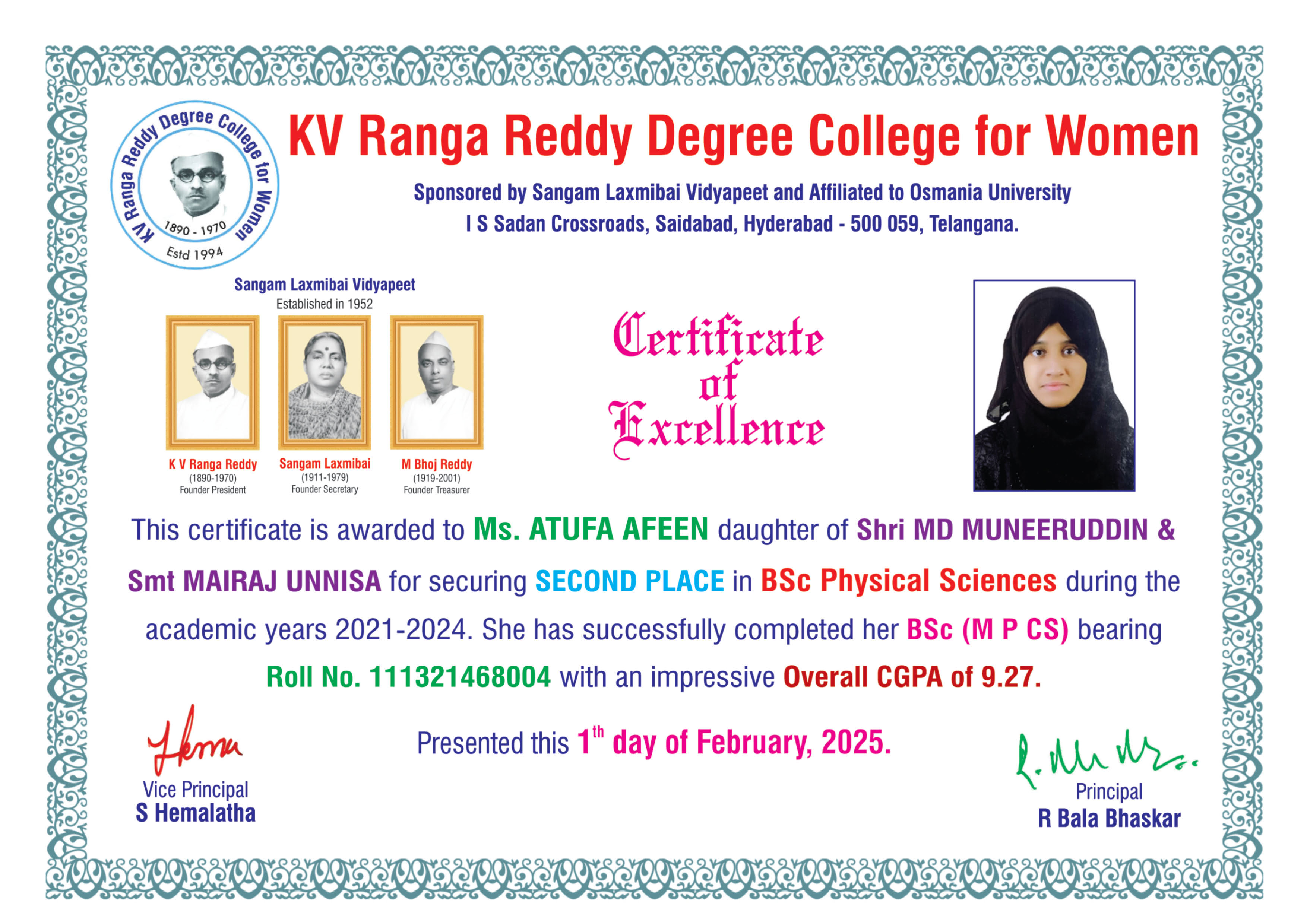 | 3. | Physical Sciences | FIRST | 111322467042 | BSc (M S CS) | VITYALA NIKHILA | VITYALA SURENDER | VITYALA SRILATHA | 9.11 |