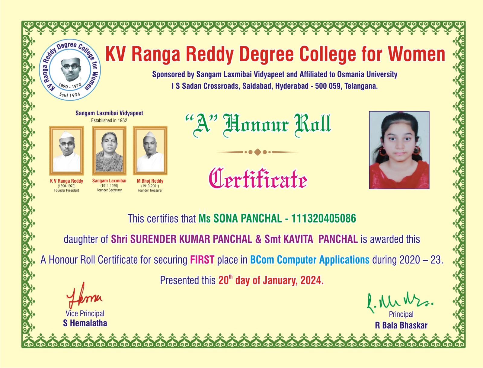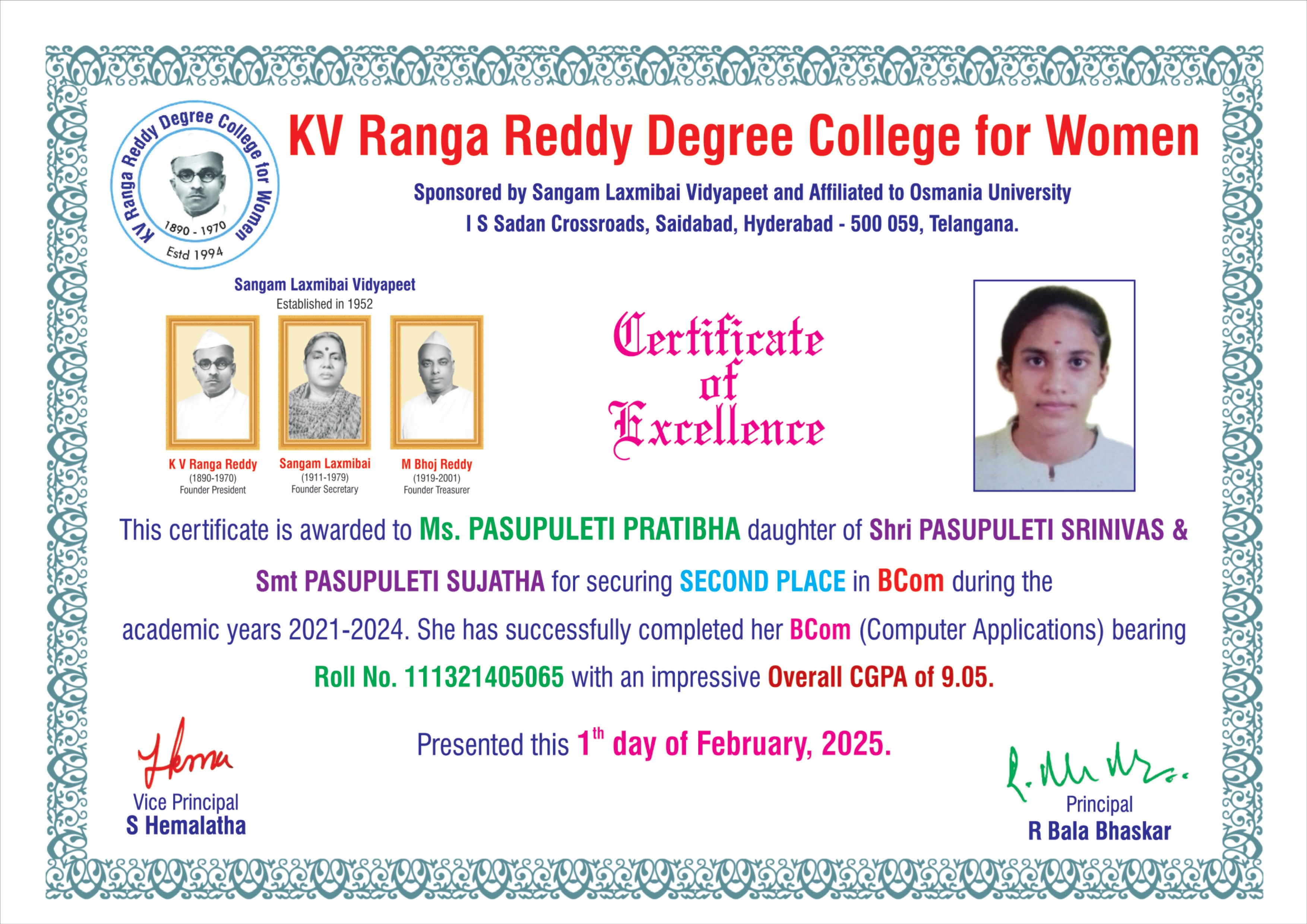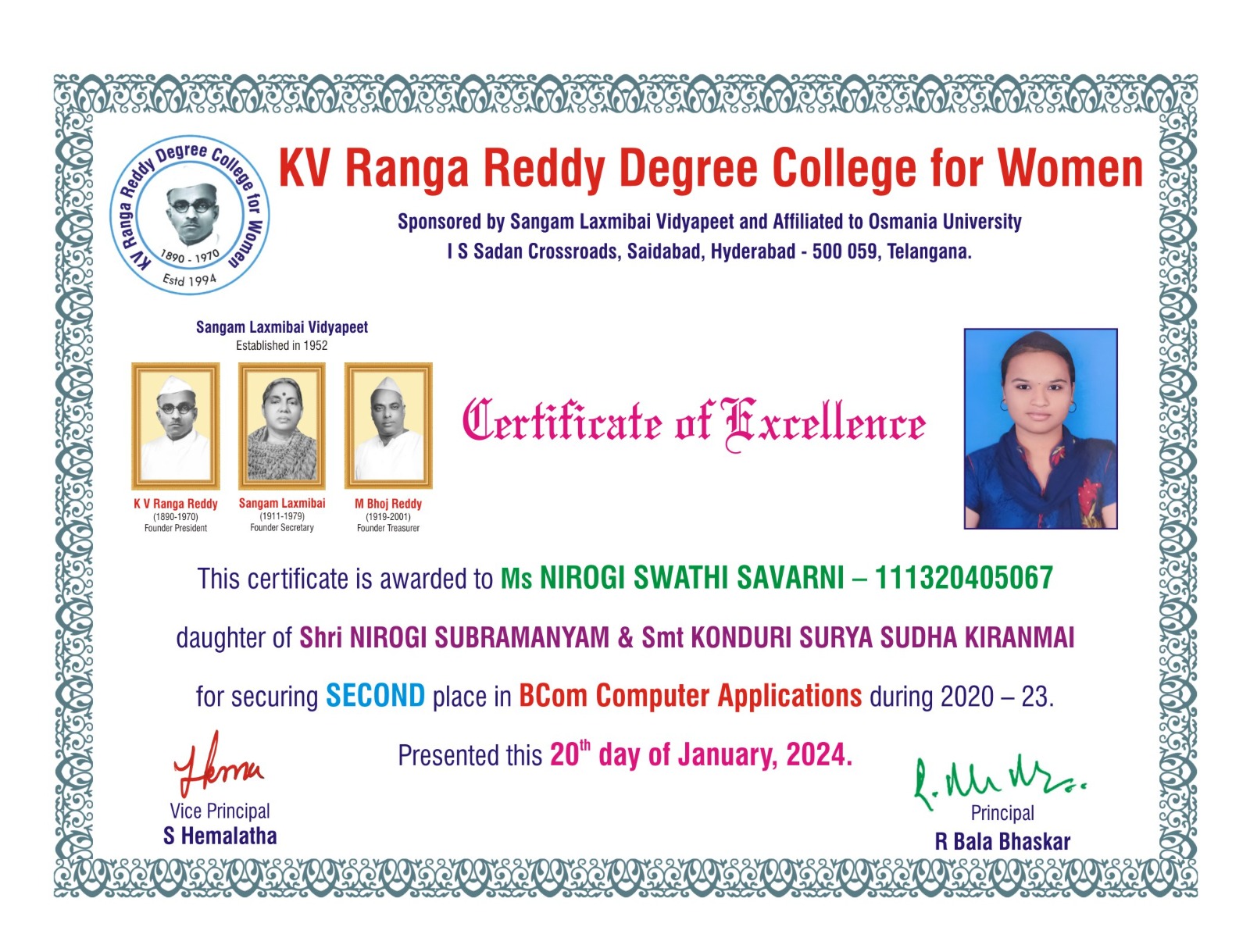 | 6. | SECOND | 111320405067 | BCom (Computer Applications) | NIROGI SWATHI SAVARNI | NIROGI SUBRAMANYAM | KONDURI SURYA SUDHA KIRANMAI | 9.03 |
