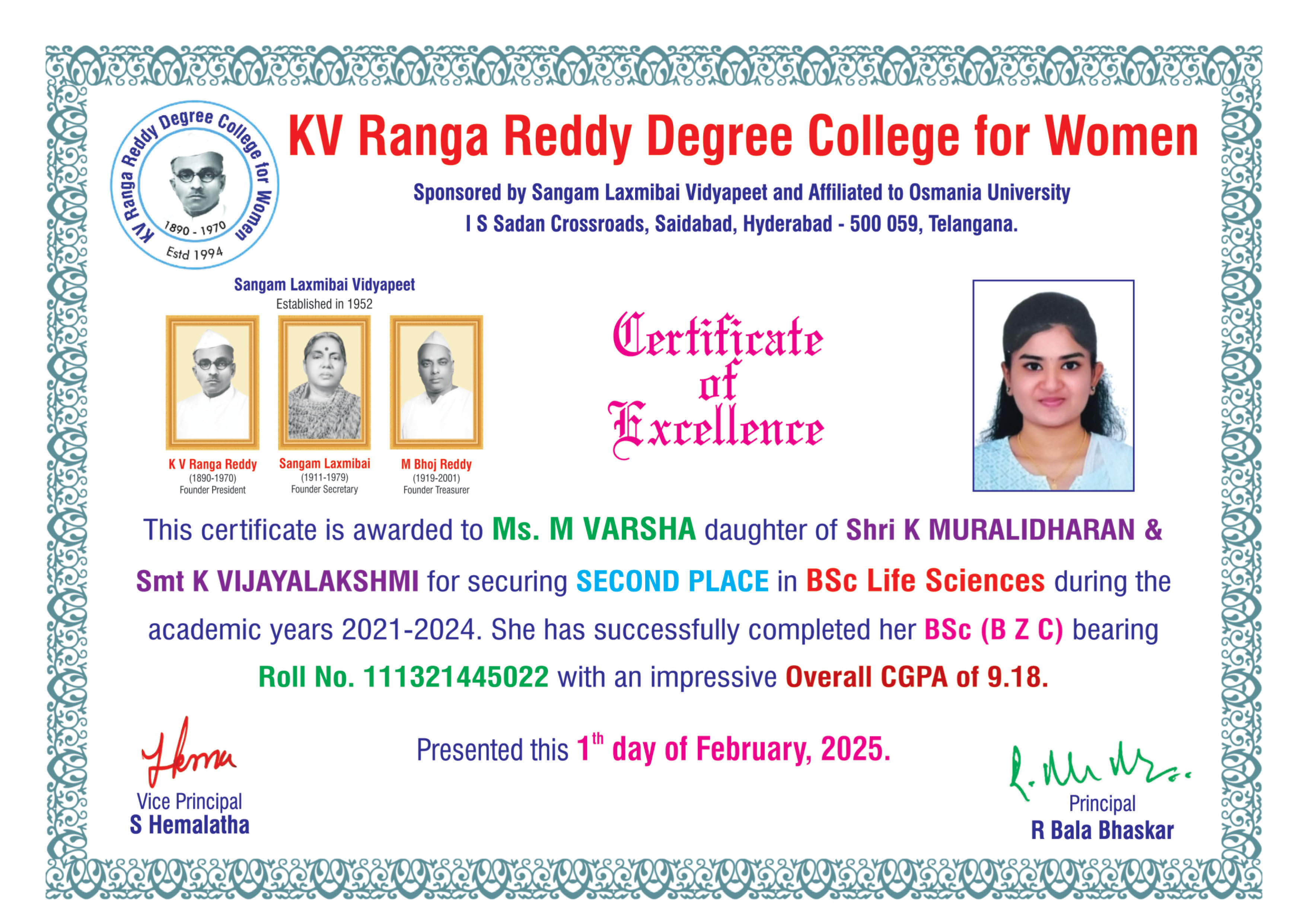 | 2. | SECOND | 111321445022 | BSc (B Z C) | M VARSHA | K MURALIDHARAN | K VIJAYALAKSHMI | 9.18 | |