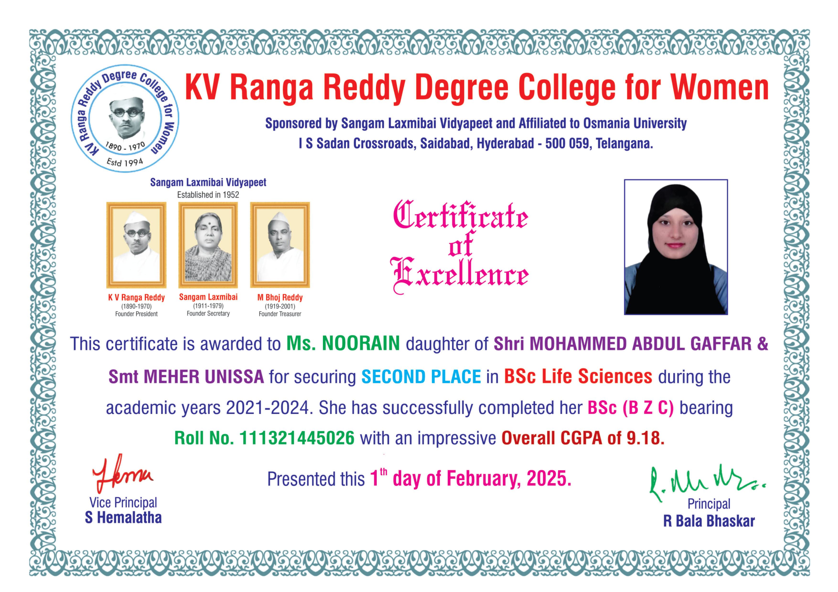 | 3. | 111321445026 | BSc (B Z C) | NOORAIN | MOHAMMED ABDUL GAFFAR | MEHER UNISSA | 9.18 | ||