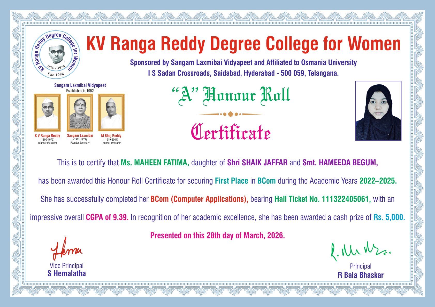 | 5. | Commerce | FIRST | 111322405061 | BCom (Computer Applications) | MAHEEN FATIMA | SHAIK JAFFAR | HAMEEDA BEGUM | 9.39 |