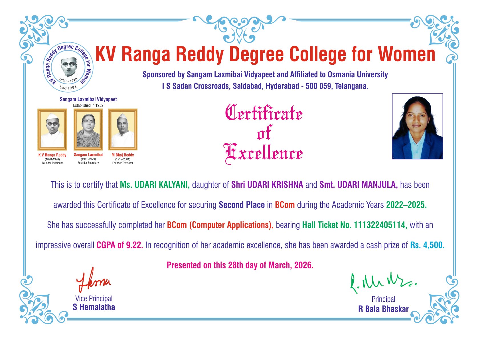 | 6. | SECOND | 111322405114 | BCom (Computer Applications) | UDARI KALYANI | UDARI KRISHNA | UDARI MANJULA | 9.22 |