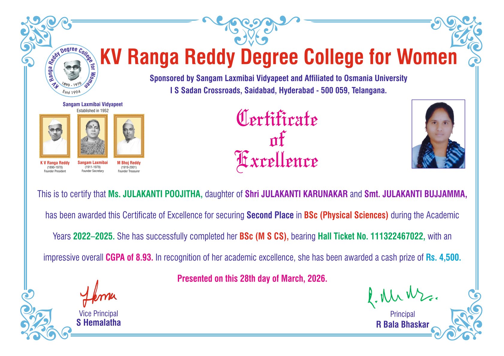 | 4. | SECOND | 111322467022 | BSc (M S CS) | JULAKANTI POOJITHA | JULAKANTI KARUNAKAR | JULAKANTI BUJJAMMA | 8.93 | |