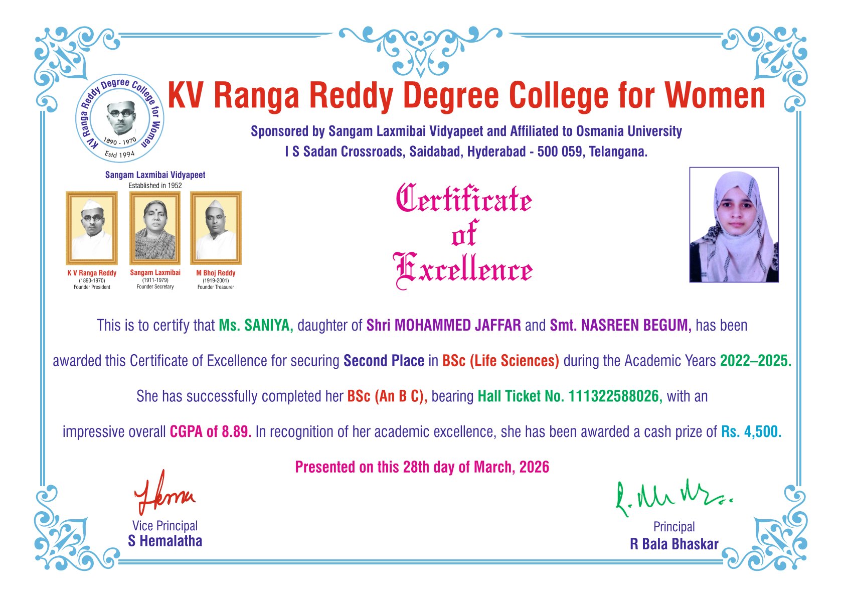 | 2. | SECOND | 111322588026 | BSc (An B C) | SANIYA | MOHAMMED JAFFAR | NASREEN BEGUM | 8.89 | |