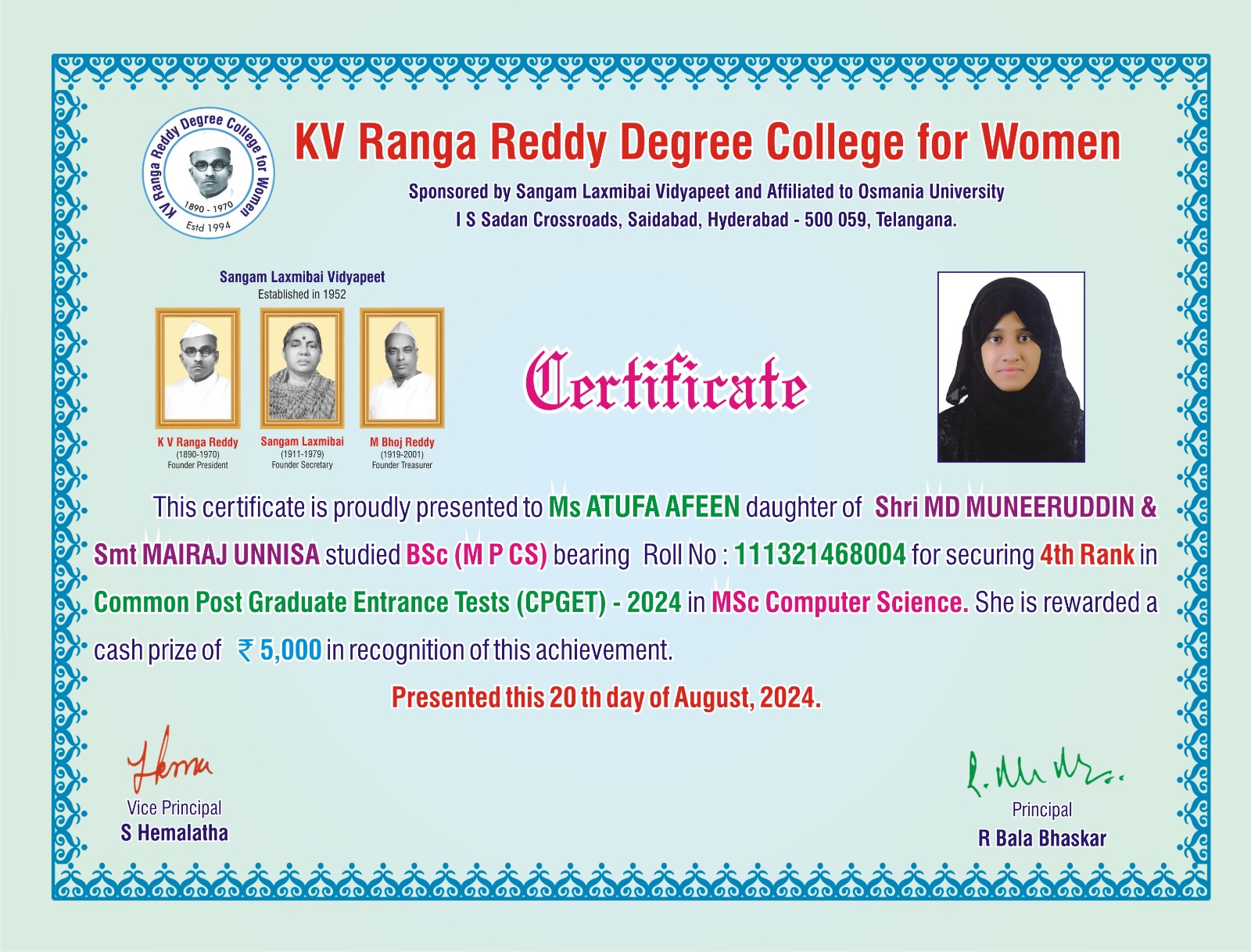 | 2. | 111321468004BSc (M P CS) | ATUFA AFEEN | MSc Computer ScienceH.T No: 63087530020 | 4th |