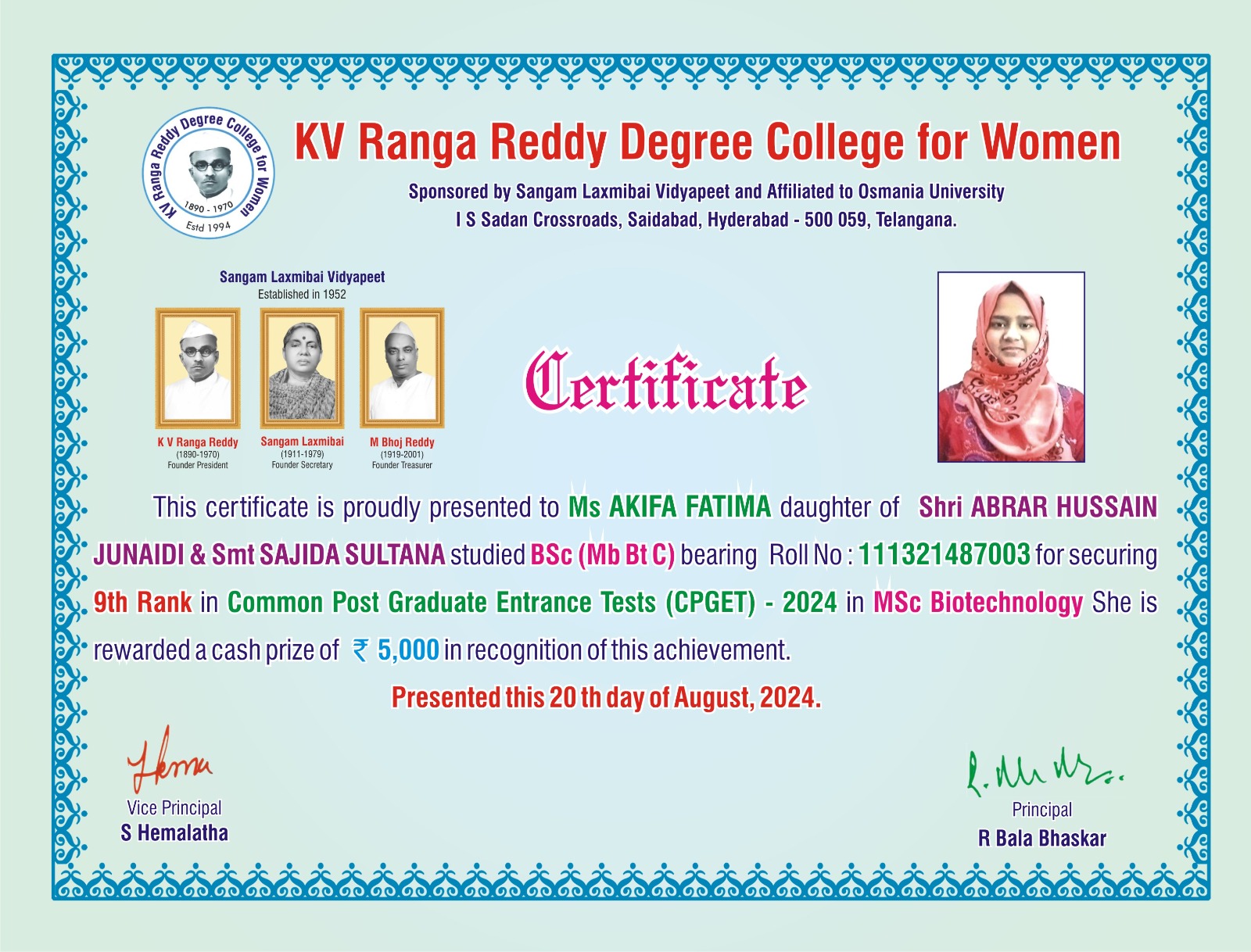 | 5. | 111321487003BSc (Mb Bt C) | AKIFA FATIMA | MSc BiotechnologyH.T No: 73088220019 | 9th |